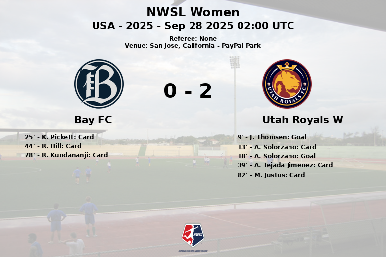 Lors d’un match qui s’est déroulé au PayPal Park de San José, en Californie, Utah Royals W a remporté une victoire face à Bay FC grâce à une solide performance. La rencontre, comptant pour la 22e journée de la saison régulière 2025 de la NWSL Women, a vu les Royals prendre l’avantage dès le début grâce à un but de J. Thomsen à la 9e minute, sur une passe décisive de P. Monaghan. La pression des visiteuses s’est poursuivie et A. Solorzano a creusé l’écart à la 18e minute.