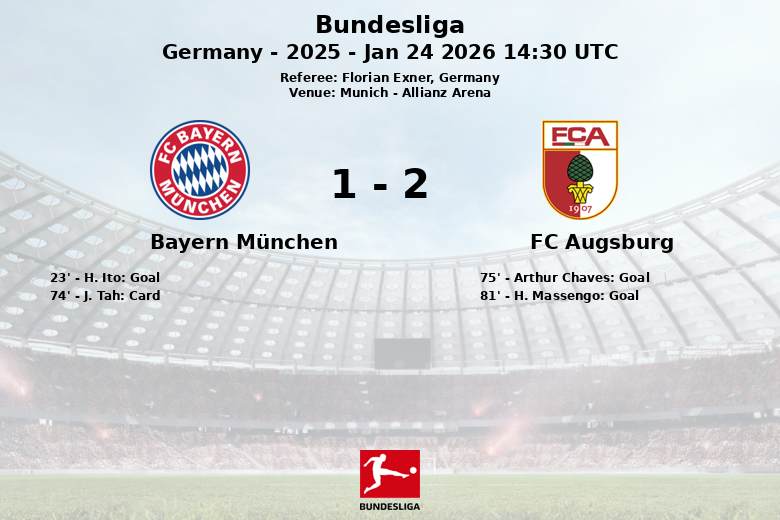 Le Bayern München a tenté de réagir, mais la défense d’Augsbourg est restée solide. Le match s’est terminé par une défaite surprenante pour le Bayern, qui, malgré la production de 14 tirs (6 cadrés) et l’obtention de 8 corners, n’a pas pu empêcher la victoire d’Augsbourg, qui, avec une possession de balle de 30%, a réussi 16 tirs (6 cadrés) et 3 corners. Le match a également été marqué par un carton jaune à J. Tah du Bayern.