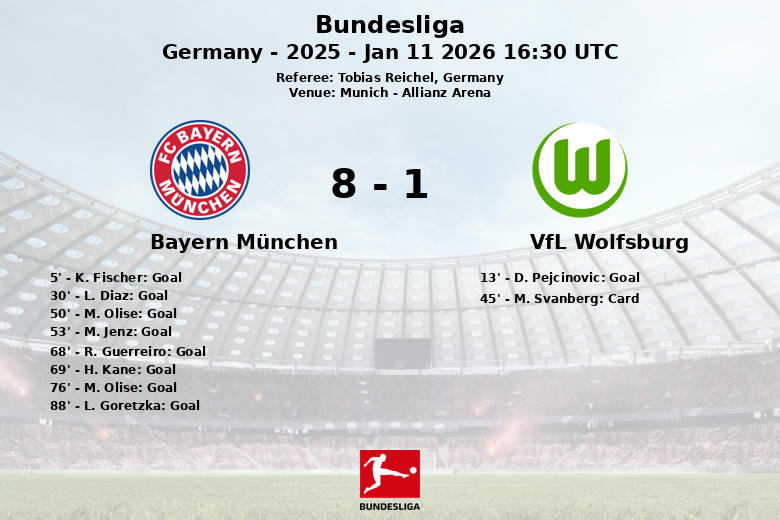 Munich, Allemagne – Le Bayern München a démontré sa puissance offensive lors d’un match qui s’est terminé par une victoire retentissante contre le VfL Wolfsburg à l’Allianz Arena. Le match, valable pour la 16e journée de Bundesliga, était arbitré par Tobias Reichel.