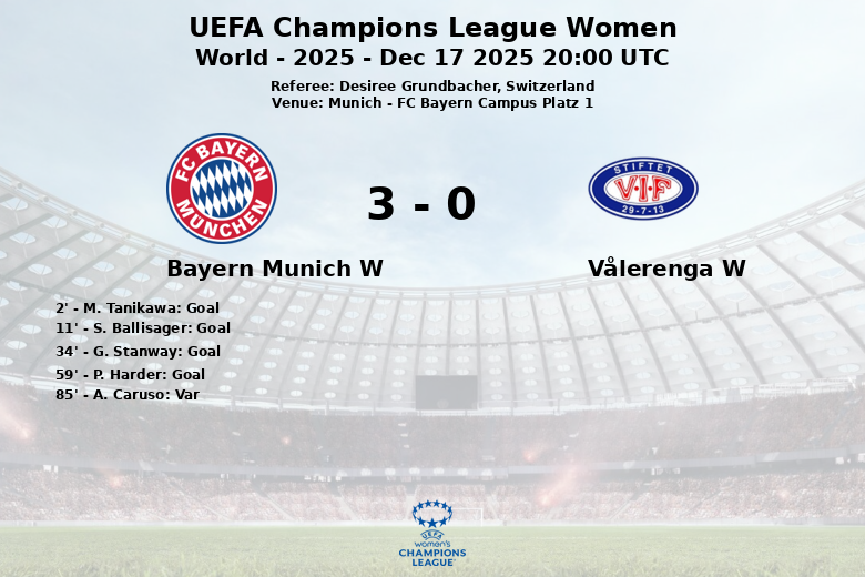 Le score a été ouvert tôt, à la 2ème minute, avec un but de M. Tanikawa, assistée par F. Kett. La pression bavaroise a continué et, à la 11ème minute, S. Ballisager a augmenté l’avance après une passe décisive de L. Dallmann. Malgré un penalty manqué à la 34e minute, G. Stanway a fait preuve de persévérance. En seconde période, P. Harder a scellé le match à la 59e minute, grâce à une passe décisive de K. Buhl. Un but d’A. Caruso a été annulé par la VAR à la 85e minute.