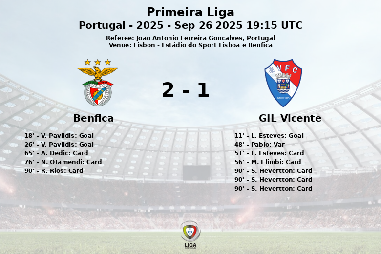 Lisbonne, Portugal – Dans un match animé à l’Estádio do Sport Lisboa e Benfica, Benfica a triomphé de Gil Vicente dans une rencontre marquée par une forte tension et plusieurs incidents. Gil Vicente a pris l’avantage dès la 11e minute avec un but de L. Esteves. Cependant, Benfica a rapidement réagi, V. Pavlidis égalisant à la 18e minute. Pavlidis a frappé à nouveau sur penalty à la 26e minute, donnant l’avantage à Benfica.