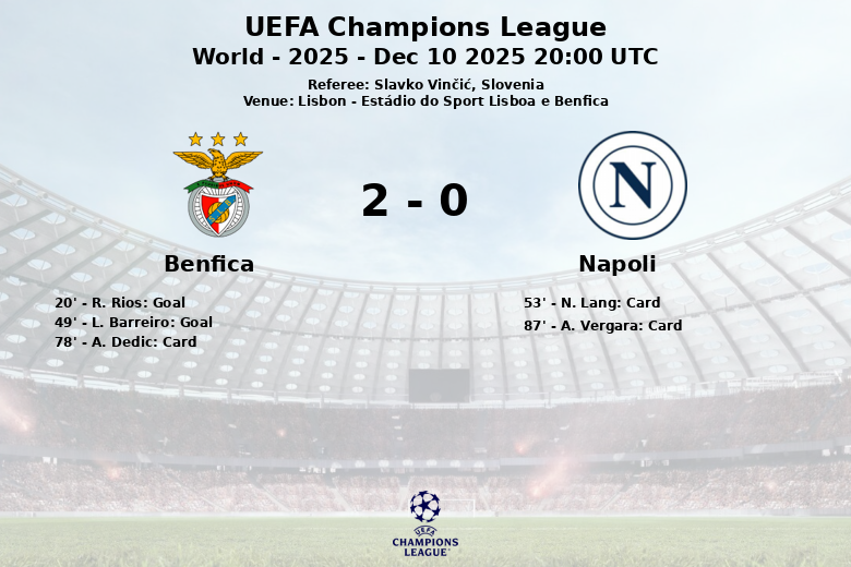 Le premier but est survenu à la 20e minute lorsque R. Rios, sur une passe de F. Ivanovic, a ouvert le score pour l’équipe locale. Après la pause, Benfica a creusé l’écart à la 49e minute avec un but de L. Barreiro, grâce à une passe décisive de R. Rios. Le match s’est poursuivi avec une forte intensité, reflétée par les cartons jaunes montrés à N. Lang et A. Vergara de Naples, et à A. Dedic de Benfica.