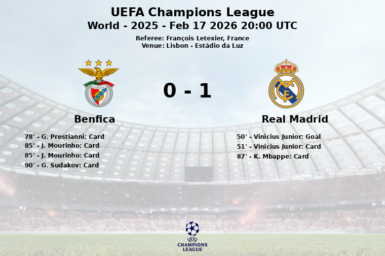 Le match a été marqué par plusieurs cartons jaunes. Vinicius Junior a été averti à la 51e minute, suivi de G. Prestianni à la 78e et K. Mbappe à la 87e, tous pour le Real Madrid. Pour Benfica, G. Prestianni, J. Mourinho et G. Sudakov ont reçu des cartons jaunes respectivement aux 78e, 85e et 90e minutes. L’arbitre du match, François Letexier, a sifflé un total de 9 fautes pour le Real Madrid et 6 pour Benfica. Le Real Madrid a obtenu 6 corners, tandis que Benfica en a eu 3.