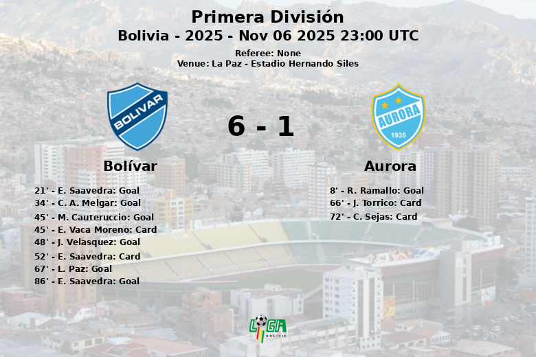 Lors d’un match disputé à l’Estadio Hernando Siles de La Paz, Bolívar a démontré sa supériorité en battant de manière convaincante Aurora sur le score de 6 à 1. Malgré un but précoce d’Aurora à la 8e minute, marqué par R. Ramallo, Bolívar a réagi avec détermination. E. Saavedra a égalisé à la 21e minute, suivi d’un penalty transformé par C. A. Melgar à la 34e minute. Avant la mi-temps, M. Cauteruccio a creusé l’écart à la 45e minute, sur une passe décisive de D. Romero.