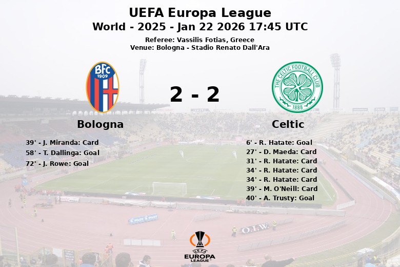 En deuxième mi-temps, Bologne a réussi à revenir au score avec des buts de T. Dallinga à la 58e minute, servi par J. Odgaard, et de J. Rowe à la 72e minute. Bologne a démontré sa domination avec 34 tirs, dont 10 cadrés, et 16 corners, contre 8 tirs pour le Celtic (5 cadrés) et 2 corners. Le Celtic a commis 11 fautes et a reçu 3 cartons jaunes, en plus du carton rouge mentionné précédemment, tandis que Bologne a commis 7 fautes et a reçu un carton jaune. L’arbitre Vassilis Fotias, de Grèce, a officié le match.