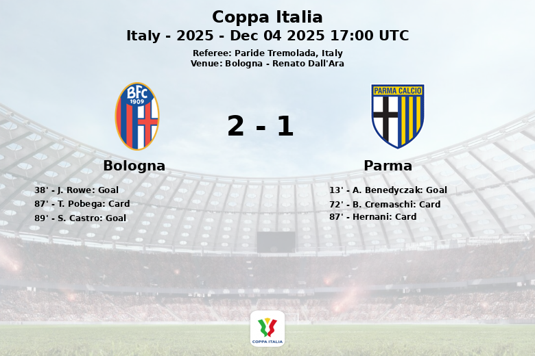Dans un match acharné au stade Renato Dall’Ara de Bologne, l’équipe locale a remporté une victoire contre Parme dans une rencontre vibrante. Parme a pris une avance rapide avec un but d’A. Benedyczak à la 13e minute, sur une passe de M. Lovik. Bologne a répondu à la 38e minute avec un but de J. Rowe, égalisant le score avant la mi-temps. Bien qu’il ait eu moins la possession du ballon (28 % contre 72 % pour Bologne), Parme s’est avéré dangereux en attaque. Cependant, c’est Bologne qui a scellé la victoire à la 89e minute avec un but de S. Castro, sur une passe d’E. Holm. Bologne a dominé la possession et a créé plus d’occasions de marquer (16 tirs contre 6 pour Parme), bien que Parme ait fait preuve d’une solidité défensive et d’une efficacité dans ses attaques. Le match, arbitré par Paride Tremolada, a été intense et a été marqué par deux cartons jaunes pour Parme et un pour Bologne.