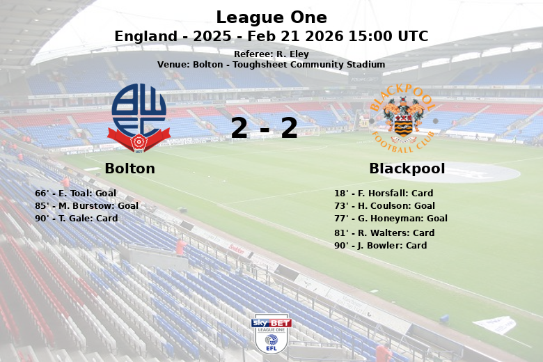 Bolton, loin d’abandonner, s’est battu jusqu’à la fin et a trouvé le but égalisateur à la 85e minute par l’intermédiaire de M. Burstow, sur une passe décisive de T. Gale, scellant un match nul vibrant de 2-2. Le match n’a pas été sans tension, avec trois cartons jaunes distribués à Blackpool (F. Horsfall, R. Walters et J. Bowler) et un à Bolton (T. Gale). L’arbitre R. Eley a également accordé 15 corners à Bolton et 4 à Blackpool. Bolton a commis 7 fautes et Blackpool 9.