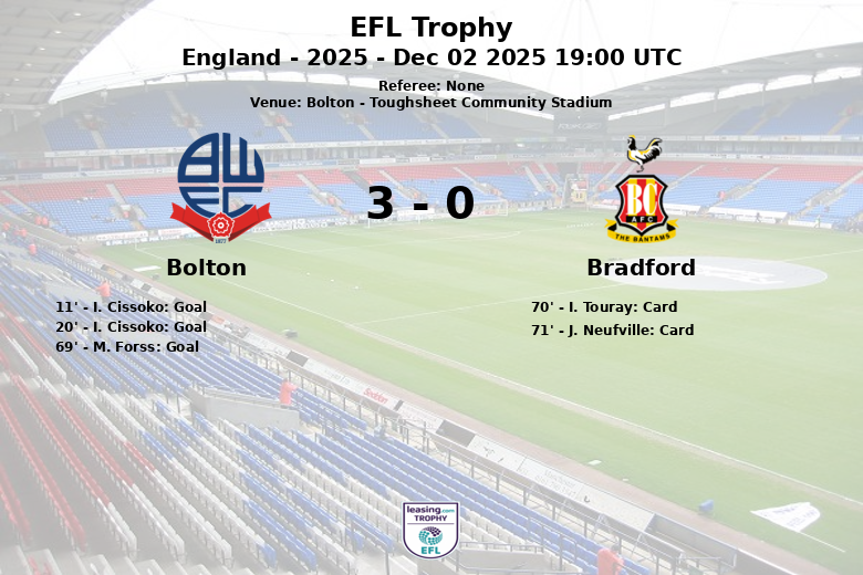 Bradford, avec seulement 38% de possession, a eu du mal à trouver son rythme, générant 9 tirs, mais un seul a atteint la cible. Leur frustration s’est manifestée par un nombre élevé de fautes (19) et deux cartons jaunes pour I. Touray et J. Neufville. Bolton, en revanche, a fait preuve de discipline et n’a reçu aucun avertissement. Le match s’est déroulé à Bolton, en Angleterre, lors de la saison 2025 de l’EFL Trophy.
