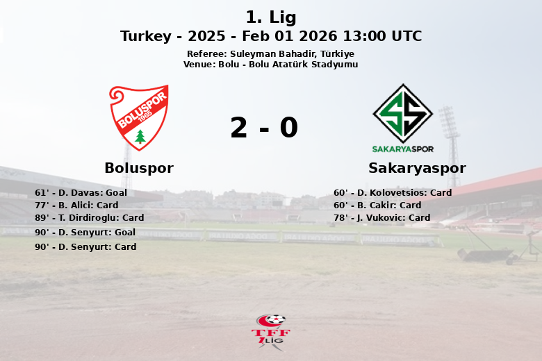 La victoire de Boluspor a été scellée à la 90e minute avec un but de D. Senyurt, sans passe décisive, assurant les trois points à domicile. Senyurt lui-même a reçu un carton jaune quelques instants plus tard. Les locaux ont effectué 13 tirs, dont 7 cadrés, tandis que Sakaryaspor n’a réussi que 6 tirs au total, dont seulement 2 dirigés vers le but adverse. Boluspor a obtenu 4 corners contre 2 pour Sakaryaspor. B. Alici et T. Dirdiroglu de Boluspor ont également reçu des cartons jaunes aux 77e et 89e minutes respectivement.