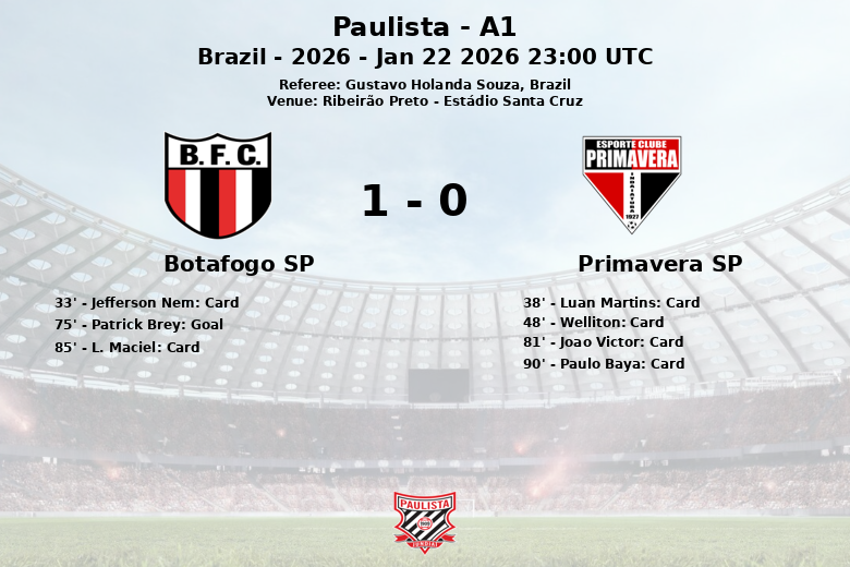 Le match a également été marqué par plusieurs cartons. Jefferson Nem, Luan Martins, Welliton, Joao Victor et L. Maciel ont reçu des cartons jaunes, tandis que Paulo Baya de Primavera SP a été expulsé avec un carton rouge à la 90e minute. L’arbitre Gustavo Holanda Souza a eu une soirée chargée à gérer les incidents du match.