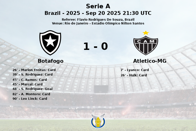 En seconde période, S. Rodriguez a marqué le seul but du match à la 48e minute, grâce à une passe décisive de A. Montoro, déclenchant l’euphorie parmi les supporters locaux. Bien que jouant à dix et ayant moins de possession de balle (33 % contre 67 % pour l’Atlético-MG), Botafogo a réussi à conserver son avance et à assurer les trois points.