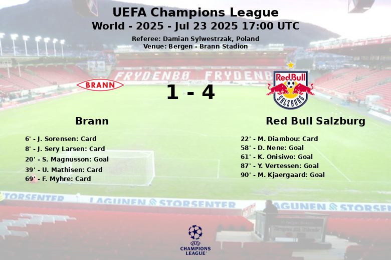 En seconde période, le Red Bull Salzbourg est revenu avec un nouvel élan. D. Nene a égalisé à la 58e minute, sur une passe de O. Gloukh. Trois minutes plus tard, K. Onisiwo a donné l’avantage à l’équipe autrichienne grâce à un but sur une passe de S. Lainer. Malgré les efforts de Brann pour égaliser, Y. Vertessen a creusé l’écart à la 87e minute, sur une passe de S. Kitano. Le coup de grâce est intervenu à la 90e minute, lorsque M. Kjaergaard a transformé un penalty, scellant le score final.
