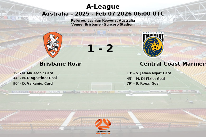 En seconde période, Central Coast Mariners a dominé la possession avec 58%, bien que les deux équipes aient cherché le but de la victoire. Sergi Roux de Central Coast Mariners a inversé le score à la 79e minute, sans passe décisive. Brisbane Roar, bien qu’ayant moins de possession (42%), a tenté de créer du danger avec 12 tirs, dont seulement 2 cadrés. D. Valkanis de Brisbane Roar a reçu un carton jaune à la 90e minute. Finalement, le match nul est resté jusqu’au coup de sifflet final. Les Mariners ont commis moins de fautes (9) que le Roar (17).