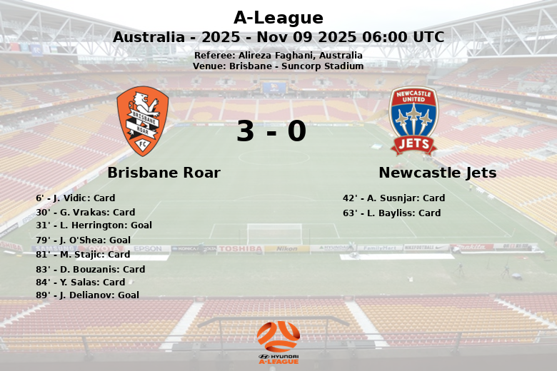 Brisbane, Australie – Un match intense et disputé a eu lieu au Suncorp Stadium, où Brisbane Roar a battu Newcastle Jets sur le score de 3 à 1. Le match, correspondant à la quatrième journée de la saison régulière de la A-League, a été marqué par de nombreux cartons jaunes et des moments de tension sur le terrain.