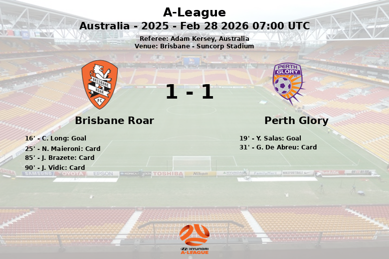 Brisbane Roar a pris l’avantage en début de match, à la 16e minute, avec un but de C. Long sur une passe décisive de J. O’Shea. Cependant, la joie locale a été de courte durée, car à peine trois minutes plus tard, Y. Salas a marqué contre son camp pour égaliser le score en faveur de Perth Glory.