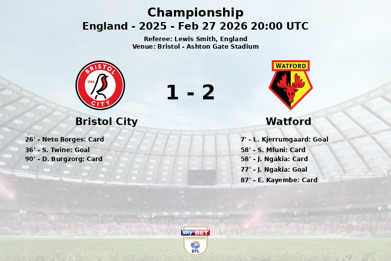 La seconde mi-temps a continué sur un rythme intense. Watford a reçu deux cartons jaunes presque consécutifs à S. Mfuni et J. Ngakia à la 58e minute. Cependant, J. Ngakia s’est racheté en marquant un but crucial à la 77e minute, de nouveau sur une passe décisive de E. Kayembe, redonnant l’avantage à Watford. Bristol City, se battant pour sauver des points à domicile, a généré 11 tirs au total, dont 4 cadrés. Le match a été marqué par un nombre élevé de fautes commises par Watford (10) par rapport à Bristol City (5). L’arbitre Lewis Smith a également distribué des cartons jaunes à E. Kayembe et D. Burgzorg en fin de match.