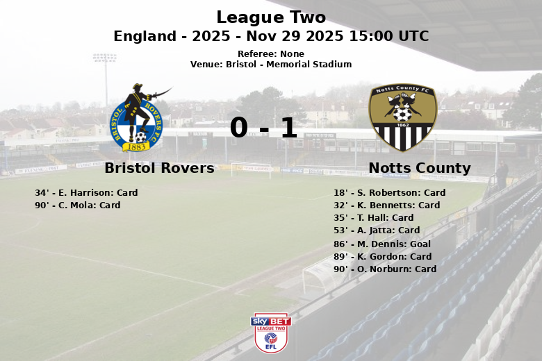 Le match a été marqué par l’agressivité, avec un total de neuf cartons distribués. Notts County a particulièrement souffert, avec quatre cartons jaunes et un carton rouge direct pour T. Hall à la 35e minute, laissant l’équipe à dix pendant une grande partie du match. Malgré le fait de jouer à dix, Notts County a tenu bon, profitant de l’une de ses rares occasions pour égaliser à la 86e minute grâce à un but de M. Dennis, servi par K. Gordon. Bristol Rovers, malgré son avantage numérique et sa maîtrise du jeu, n’a pas réussi à concrétiser sa domination en buts, et le match s’est terminé par un match nul frustrant pour l’équipe locale. La discipline tactique et l’esprit combatif de Notts County ont été cruciaux pour obtenir un point précieux dans un match difficile.