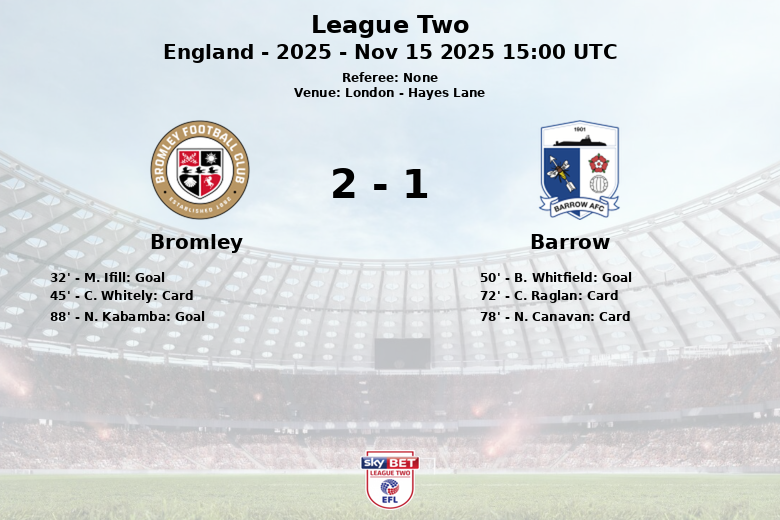 Remplacements dans l’quipe de bromley: À la 59e minute, J. Arthurs est entré et B. Krauhaus est sorti., À la 68e minute, C. Whitely est entré et N. Kabamba est sorti., À la 81e minute, M. Ifill est entré et B. Ilunga est sorti.