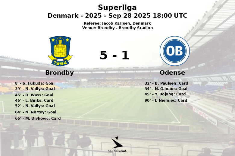 Brondby a ouvert le score tôt, à la 8e minute, grâce à un but de S. Fukuda. Odense a répondu à la 34e minute avec un but de N. Ganaus, égalisant le score. Cependant, Brondby a repris l’avantage avant la mi-temps avec des buts de N. Vallys à la 39e minute et de D. Wass sur penalty à la 45e minute.