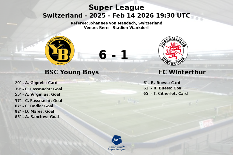 Young Boys a ouvert le score à la 39e minute avec un but de C. Fassnacht, sur une passe décisive de C. Bedia. La seconde mi-temps a été marquée par une poussée offensive de l’équipe bernoise, avec des buts de A. Virginius à la 55e minute et de nouveau Fassnacht à la 57e minute. Winterthur a tenté de revenir dans le match, en réduisant le score à la 61e minute grâce à R. Buess, sur une passe de A. Hunziker, mais Young Boys a rapidement répondu avec un but de C. Bedia à la 67e minute, sur une passe de A. Virginius. Le score a été complété par deux autres buts pour Young Boys, grâce à D. Males à la 82e minute et A. Sanches à la 85e minute.