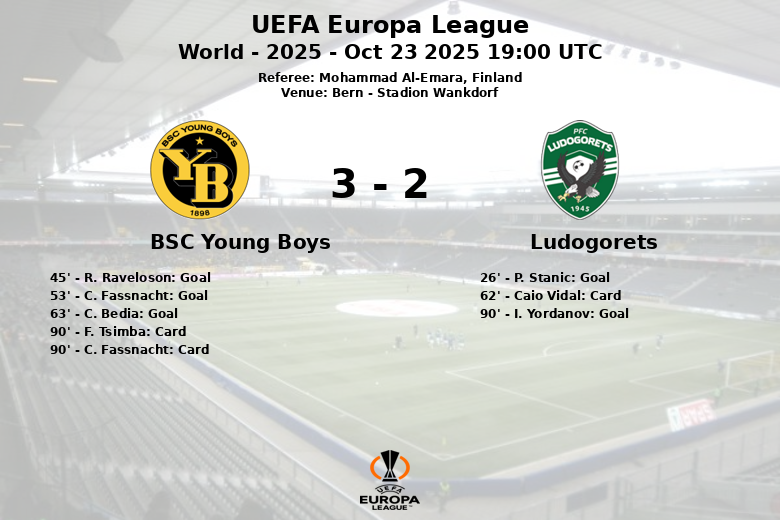 Ludogorets, bien qu’ayant moins de possession du ballon (41 % contre 59 % pour Young Boys), n’a pas abandonné et s’est battu jusqu’à la fin. I. Yordanov a marqué un but à la 90e minute, réduisant l’écart, mais cela n’a pas suffi à éviter la défaite. Le match s’est terminé avec un total de 15 tirs pour chaque équipe, bien que Young Boys ait fait preuve d’une plus grande précision avec 6 tirs cadrés contre 4 pour Ludogorets. L’arbitre a averti Caio Vidal de Ludogorets et F. Tsimba et C. Fassnacht de Young Boys.
