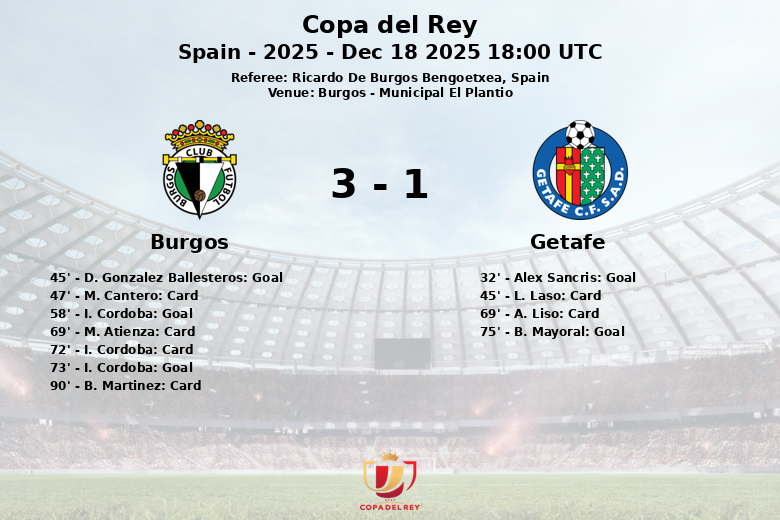 La seconde période a été favorable à Burgos, avec I. Cordoba marquant à la 58ème minute sur une passe de V. Mollejo, et à nouveau à la 73ème minute, cette fois sans passe décisive, scellant la victoire. Getafe a eu l’occasion de réduire l’écart, mais B. Mayoral a manqué un penalty à la 75ème minute. Le match a été marqué par l’intensité, avec plusieurs cartons jaunes distribués par l’arbitre Ricardo De Burgos Bengoetxea aux deux équipes. Statistiquement, Burgos a tiré 7 fois, dont 4 cadrés, tandis que Getafe a tenté 11 tirs, également avec 4 cadrés. Burgos a commis 17 fautes et Getafe 15.