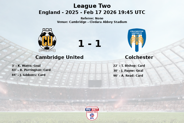Cambridge, Angleterre – Dans un match disputé au Cledara Abbey Stadium, Cambridge United et Colchester United ont fait match nul dans une rencontre pleine d’émotions dès le début. Cambridge United a pris l’avantage tôt, à la 3e minute, grâce à un but de K. Watts sur une passe décisive de B. Knight, suscitant l’espoir des supporters locaux. Cependant, Colchester a réagi une demi-heure plus tard, à la 30e minute, avec un but de J. Payne, égalisant le score.
