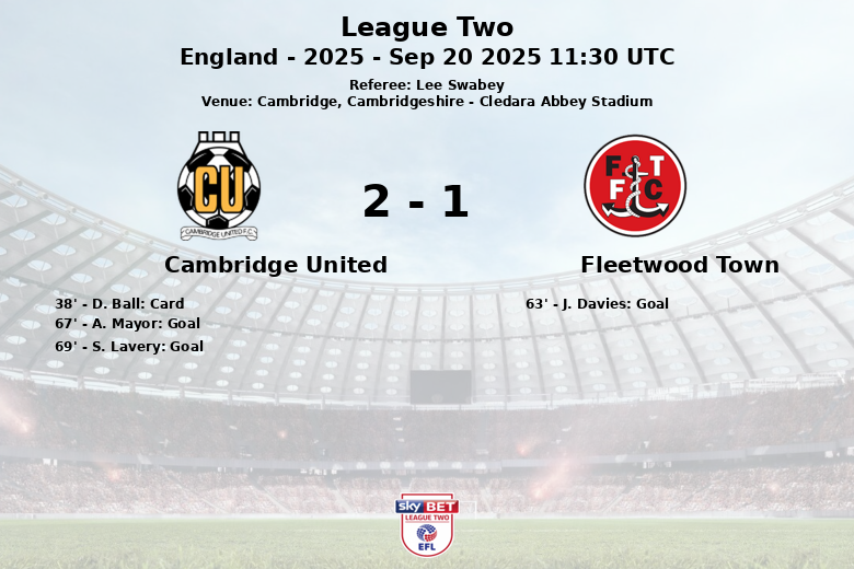 Cambridge, Cambridgeshire – Dans un match disputé au Cledara Abbey Stadium, Cambridge United a remporté une victoire importante contre Fleetwood Town avec un score final de 2-1. Le match, comptant pour la neuvième journée de League Two, était arbitré par Lee Swabey.