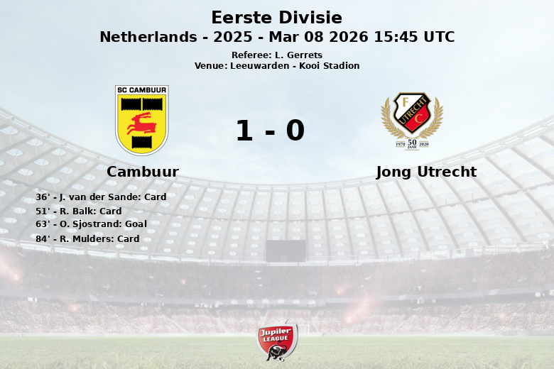 Malgré une possession légèrement supérieure pour Cambuur (54% contre 46% pour Jong Utrecht), le match est resté équilibré pendant une grande partie du temps. La première mi-temps a vu un carton jaune pour J. van der Sande de Cambuur à la 36e minute et aucun but, indiquant une défense solide des deux équipes.