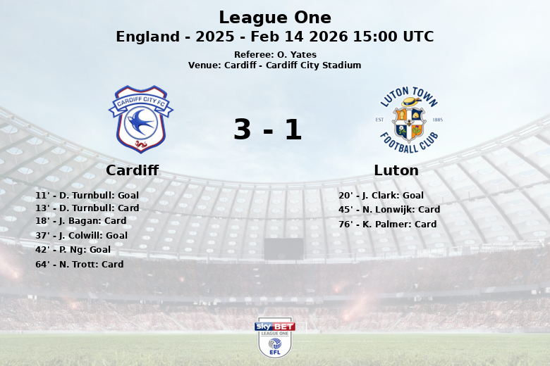 Le score a été ouvert tôt, à la 11e minute, avec un but de D. Turnbull, sur une passe de J. Colwill. Luton a répondu avec un penalty transformé par J. Clark à la 20e minute, mais Cardiff a repris le contrôle du match avant la mi-temps. J. Colwill est réapparu, marquant cette fois un but à la 37e minute grâce à une passe décisive de O. Tanner, suivi d’un but de P. Ng à la 42e minute, sur une passe de A. Robertson, augmentant l’avance de l’équipe locale.