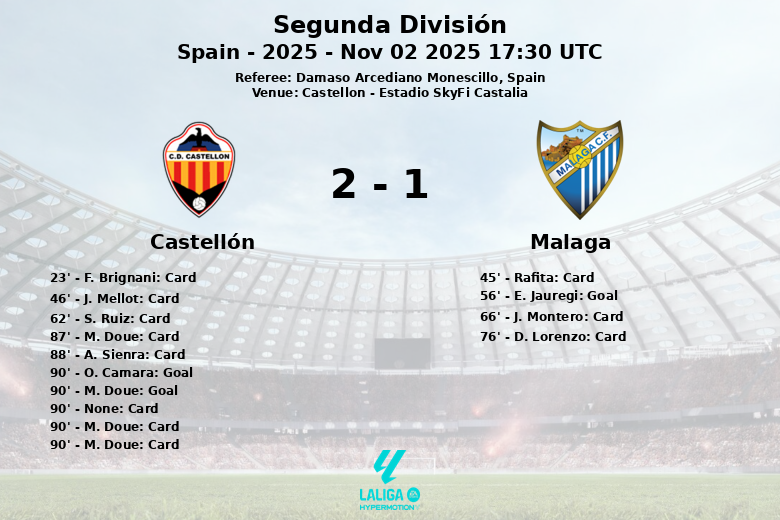 Remplacements dans l’quipe de castellón: À la 46e minute, Ronaldo est entré et M. Doue est sorti., À la 64e minute, Barri est entré et I. Suero est sorti., À la 64e minute, S. Ruiz est entré et A. Sienra est sorti., À la 64e minute, P. Santiago est entré et K. Mamah est sorti., À la 76e minute, F. Brignani est entré et O. Camara est sorti.