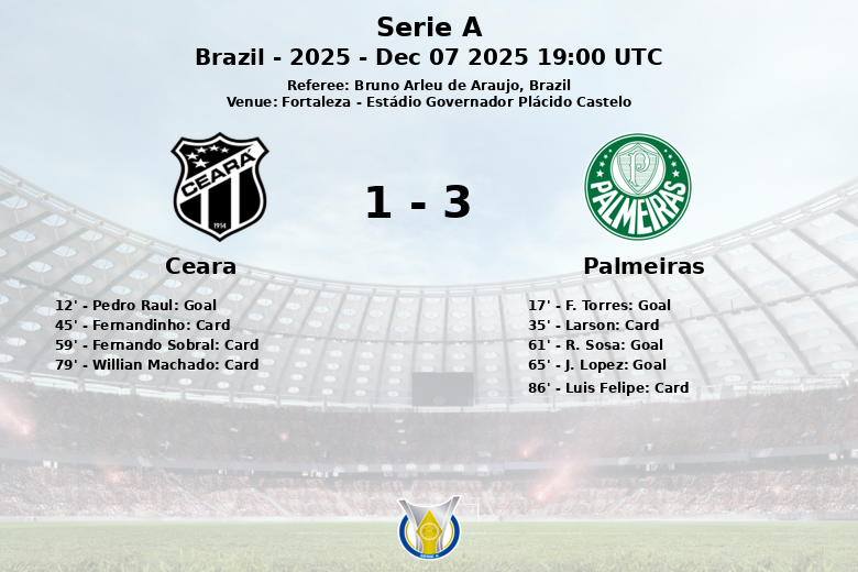 Fortaleza, Brésil – Lors d’un match disputé à l’Estádio Governador Plácido Castelo, Palmeiras a affiché sa domination face à Ceará dans un match du championnat brésilien de Série A. Bien que Ceará ait ouvert le score dès la 12e minute avec un but de Pedro Raul, assisté par Willian Machado, Palmeiras a répondu avec force. F. Torres a égalisé à la 17e minute grâce à une passe décisive de Bruno Fuchs.