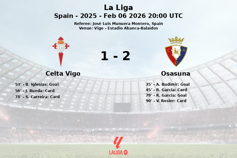Le Celta Vigo a réagi en seconde période et a réussi à égaliser à la 53e minute grâce à un penalty transformé par B. Iglesias. Cependant, Osasuna a repris l’avantage à la 79e minute avec un but de R. Garcia, assisté par A. Catena.