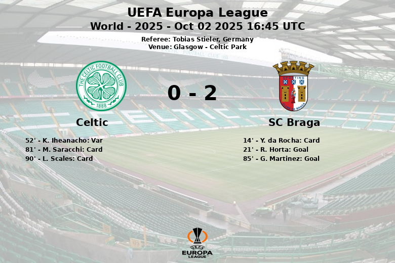 Glasgow a été le théâtre d’un match disputé de la Ligue Europa de l’UEFA où le SC Braga a battu le Celtic sur le score final de deux à zéro. Le match, joué au Celtic Park, a vu Braga prendre l’avantage à la 21e minute grâce à un but de Ricardo Horta, servi par Gorby. Malgré la domination du Celtic en termes de possession (56 %), ils n’ont pas réussi à transformer leurs occasions en buts. En fait, un but d’Iheanacho pour le Celtic a été refusé pour hors-jeu à la 52e minute après vérification du VAR. Braga, avec 44 % de possession, a fait preuve d’efficacité devant le but, avec 13 tirs au total, dont 6 cadrés. Le Celtic a tenté d’inverser la situation, obtenant 7 corners, mais n’a pas réussi à les exploiter. Braga a scellé la victoire à la 85e minute avec un but de G. Martinez, sans passe décisive. Le match a également été marqué par trois cartons jaunes, un pour Braga et deux pour le Celtic.