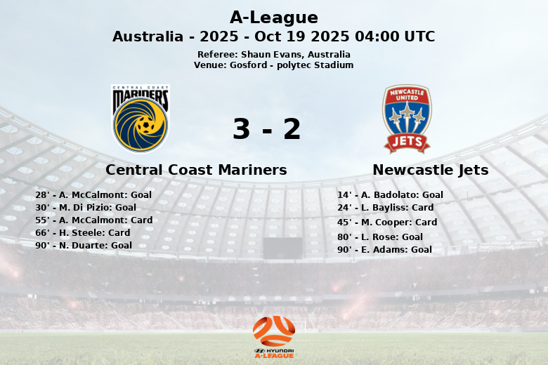 Le match a commencé avec un but rapide d’A. Badolato pour Newcastle Jets à la 14e minute, donnant l’impression qu’ils allaient contrôler la rencontre. Cependant, Central Coast Mariners a répondu avec force. A. McCalmont a égalisé sur penalty à la 28e minute, rapidement suivi d’un but de M. Di Pizio à la 30e minute, mettant les Mariners en tête.