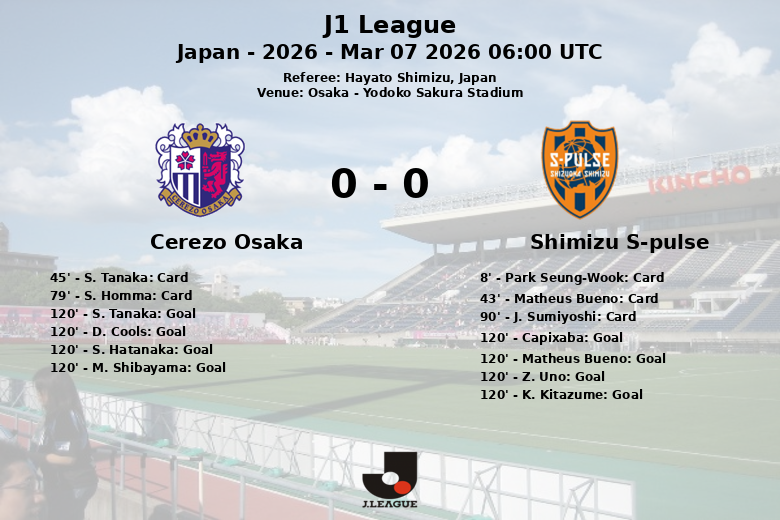 La tension sur le terrain s’est traduite par un total de cinq cartons jaunes, deux pour Cerezo Osaka (S. Tanaka et S. Homma) et trois pour Shimizu S-Pulse (Park Seung-Wook, Matheus Bueno et J. Sumiyoshi).