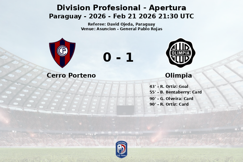 Dans un match disputé au stade General Pablo Rojas d’Asunción, Olimpia s’est imposé face à Cerro Porteño sur le score de 1 à 0. L’unique but de la rencontre a été marqué à la 43e minute par R. Ortiz, sur une passe décisive de M. Gamarra.