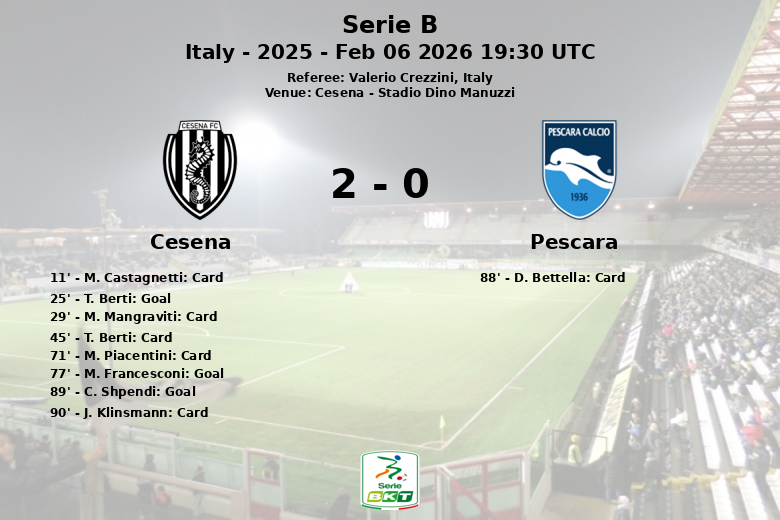 Le premier but du match est arrivé à la 25e minute, grâce à T. Berti, après une passe décisive de C. Shpendi, déclenchant l’euphorie chez les supporters locaux. L’intensité du jeu s’est reflétée dans les avertissements constants, l’arbitre ayant distribué plusieurs cartons jaunes, quatre pour Cesena et un pour Pescara, soulignant la lutte constante pour le contrôle du milieu de terrain.