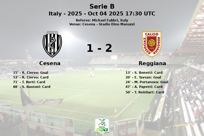 Lors d’un match disputé au Stadio Dino Manuzzi à Cesena, Reggiana a remporté la victoire avec un score de 1 à 2. Malgré la possession du ballon favorable à Cesena (61%), Reggiana s’est montrée plus efficace devant le but.