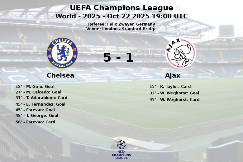 M. Guiu a ouvert le score pour Chelsea à la 18e minute, assisté par W. Fofana, lançant un assaut offensif. M. Caicedo a élargi l’avance à la 27e minute, avec une passe décisive de J. Gittens. L’Ajax a réussi à réduire l’écart grâce à un penalty transformé par W. Weghorst à la 33e minute, mais Chelsea a répondu avant la mi-temps avec deux autres penalties, marqués par E. Fernandez et Estevao à la 45e minute.