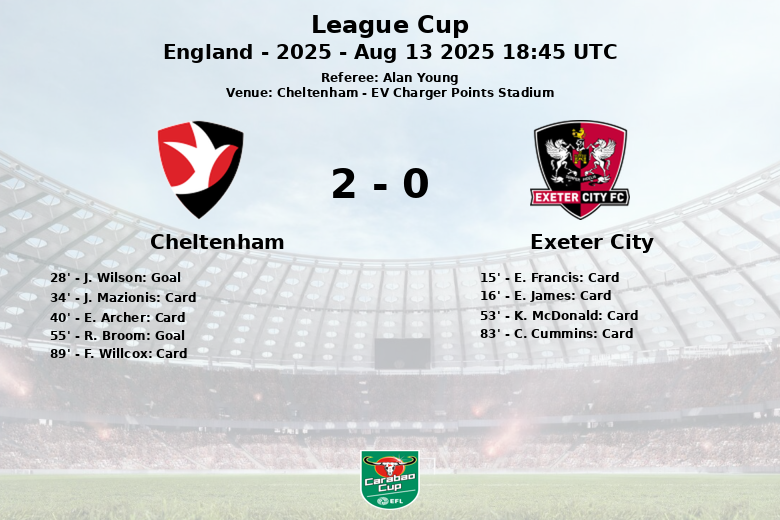 Cheltenham, Angleterre – Lors d’un match disputé à l’EV Charger Points Stadium, Cheltenham a triomphé d’Exeter City avec un score de 2 à 0 au premier tour de la League Cup. Le match, arbitré par Alan Young, a été marqué par un nombre élevé de cartons jaunes, reflétant l’intensité avec laquelle les deux équipes ont abordé la rencontre.