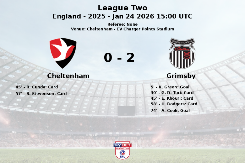 Malgré un plus grand nombre de tirs cadrés (5 contre 2), Cheltenham n’a pas réussi à concrétiser ses occasions. Grimsby, en revanche, s’est montré plus efficace, A. Cook creusant l’écart à la 74e minute, grâce à une passe de J. Kabia. Cheltenham a obtenu 7 corners, mais n’a pas pu les exploiter. Le match s’est terminé par une victoire de Grimsby, qui a fait preuve d’une plus grande solidité et d’une plus grande efficacité devant le but.
