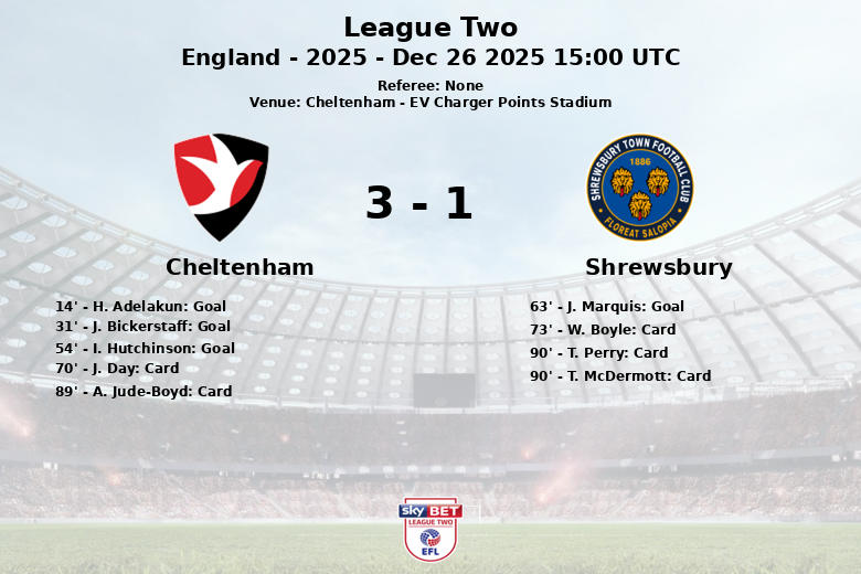 Cheltenham, Angleterre – Lors d’un Boxing Day mémorable à l’EV Charger Points Stadium, Cheltenham Town a remporté une solide victoire contre Shrewsbury. Le match de League Two, correspondant à la 22e journée, a vu les locaux prendre rapidement l’avantage. H. Adelakun a ouvert le score à la 14e minute, sur une passe de J. Thomas, déclenchant la joie dans les tribunes. L’avance a été étendue à la 31e minute avec un but de J. Bickerstaff, sur une passe décisive d’Adelakun lui-même, démontrant la connexion entre les deux joueurs.