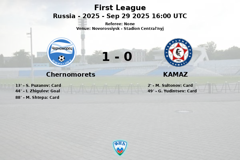 Novorossiysk, Russie – Lors d’un match correspondant à la 12e journée de la Première Ligue russe, le Chernomorets a réussi à surmonter KAMAZ au Stadion Central’nyj. Une rencontre tendue avec plusieurs cartons jaunes, où le seul but de I. Zhigulev à la 44e minute, après une action sans assistance apparente, a suffi pour faire pencher la balance en faveur de l’équipe locale.