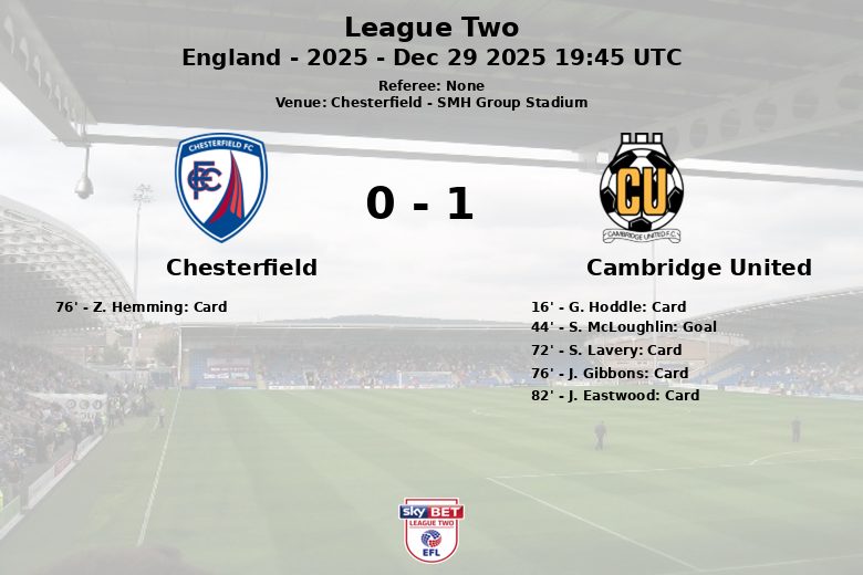 Chesterfield, Angleterre – Lors d’un match comptant pour la 23e journée de League Two, Cambridge United a remporté une précieuse victoire à l’extérieur contre Chesterfield au SMH Group Stadium. L’unique but du match, marqué par S. McLoughlin à la 44e minute, sur une passe décisive de J. Brophy, a suffi à faire pencher la balance en faveur de Cambridge.