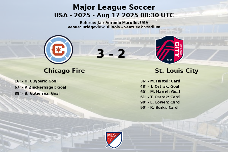 Chicago Fire a dominé la possession avec 51%, générant un total de 19 tirs, bien que seulement 5 d’entre eux aient trouvé le cadre. H. Cuypers a ouvert le score pour l’équipe locale à la 16e minute. St. Louis City, de son côté, a cherché avidement l’égalisation, générant 13 tirs, dont 3 cadrés. T. Ostrak a égalisé à la 48e minute, suivi de M. Hartel qui a donné l’avantage à l’équipe visiteuse à la 60e minute. P. Zinckernagel a égalisé pour Chicago à la 67e minute, et B. Gutierrez a mis le score à 3 à 2 à la 88e minute, mais l’avantage n’aura pas duré.
