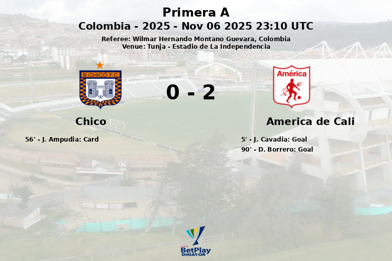 L’équipe « Escarlata » a frappé la première en début de match, avec un but de J. Cavadia à la 5e minute, suite à une passe décisive précise de T. Palacios. Bien que Boyacá Chicó ait dominé la possession du ballon avec 60 %, América de Cali s’est montré plus efficace devant le but adverse. L’équipe locale a tenté de trouver l’égalisation tout au long du match, générant 7 tirs, dont seulement 2 ont été cadrés.