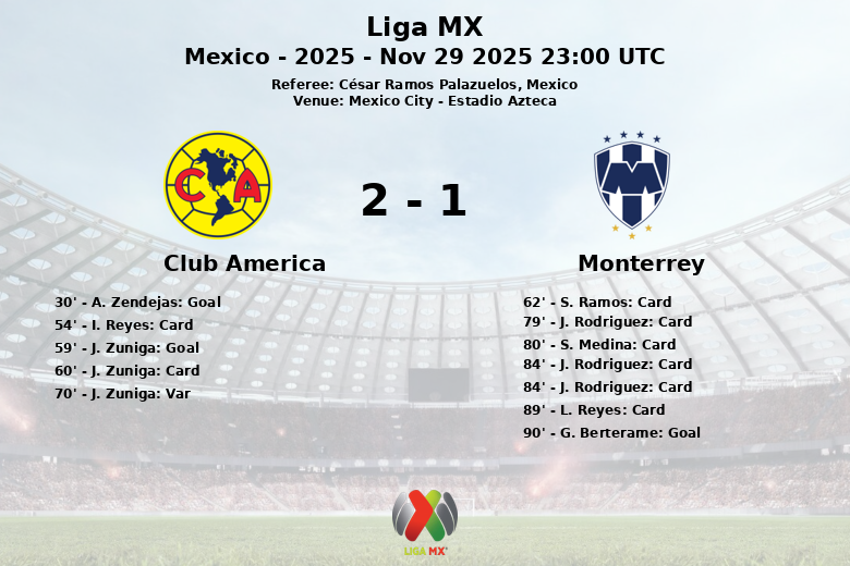 Le match a été caractérisé par un jeu acharné, reflété dans le grand nombre d’avertissements. I. Reyes et J. Zuniga ont reçu des cartons jaunes pour América, tandis que S. Ramos, J. Rodriguez, S. Medina et L. Reyes ont été avertis pour Monterrey. La situation s’est aggravée pour Monterrey à la 84e minute lorsque J. Rodriguez a reçu un deuxième carton jaune, entraînant son expulsion. Dans le temps additionnel, à la 90e minute, G. Berterame a marqué pour Monterrey avec une passe décisive de R. Chavez, mais il était trop tard pour changer le destin du match.