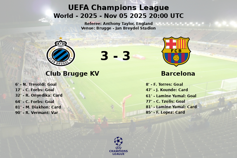 Le match s’est terminé avec un total de 21 tirs de Barcelone (6 cadrés et 11 non cadrés) et 10 du Club Brugge KV (6 cadrés et 2 non cadrés). Barcelone a dominé les corners avec 3, tandis que le Club Brugge KV n’en a obtenu aucun. Le Club Brugge KV a commis 11 fautes, recevant 2 cartons jaunes, tandis que Barcelone a commis 6 fautes et a reçu 3 cartons jaunes.