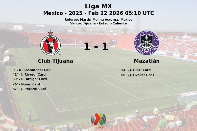 En seconde période, Mazatlán est revenu avec une énergie renouvelée. Leur pression constante a porté ses fruits à la 60ème minute, lorsque J. Ovalle a égalisé, après une action où il n’y a pas eu de passe décisive directe. Le match est devenu plus physique, avec plusieurs cartons jaunes distribués aux joueurs des deux équipes, dont R. Arciga et J. Diaz. Les dernières minutes ont été tendues, les deux équipes cherchant désespérément le but de la victoire. Tijuana a terminé avec 14 tirs, dont quatre cadrés, tandis que Mazatlán a totalisé 11 tirs, dont trois dirigés vers le but. Malgré la domination territoriale de Tijuana et les tentatives des deux côtés, le score est resté inchangé, scellant le match nul final. L’arbitre Martin Molina Astorga a averti plusieurs joueurs, dont J. Porozo à la 87ème minute.